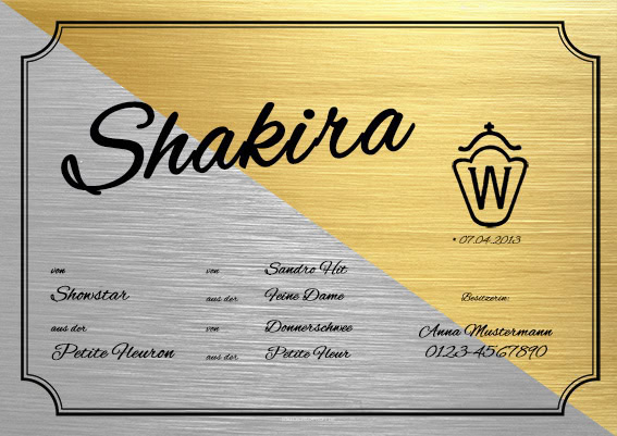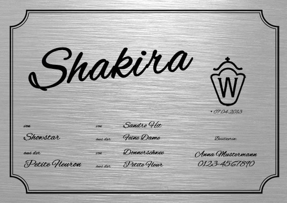 Das Pferdeschild „Shakira“ aus Alu gebürstet bietet nicht nur optische Eleganz, sondern lässt sich auch individuell gestalten – ganz nach deinen Wünschen. Ob Name des Pferdes, Geburtsjahr, Abstammung oder Stallname: Mit hochwertigem Direktdruck wird dein Design gestochen scharf und kontrastreich auf die metallisch glänzende Oberfläche gebracht.